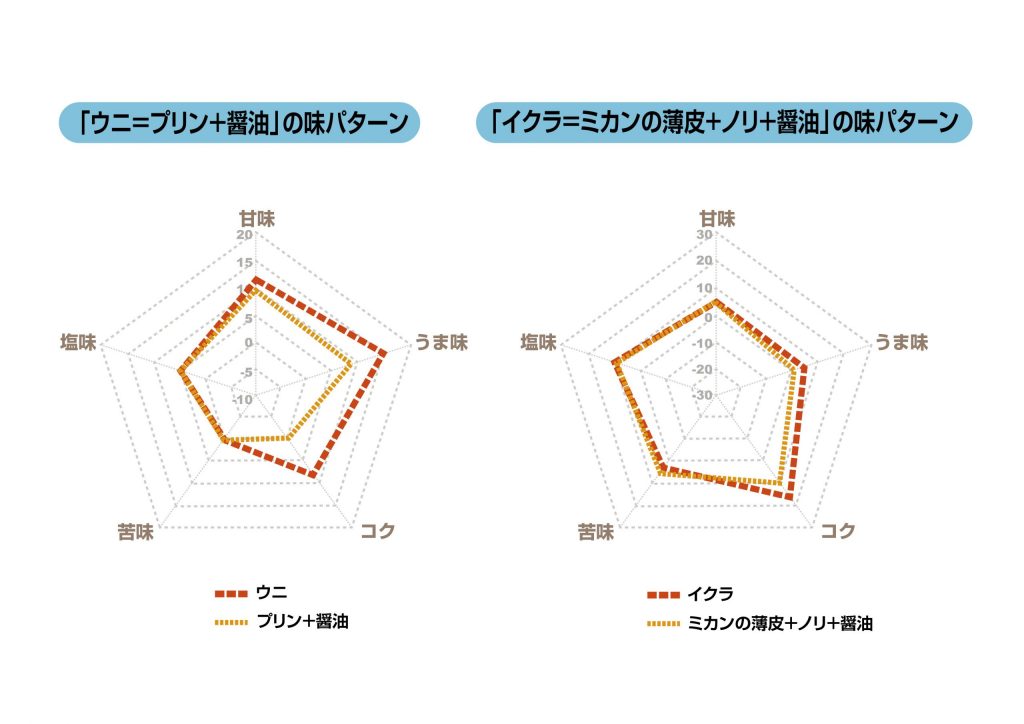いずれにしても、5種類の味を測れば、先にお話した「苦いコーヒーにミルクを入れると苦味が緩和される」といったことも、科学的に明らかにすることができます。そして、実際、どのように数値化されるのか示した例が上の図で、味覚センサーで検証するとウニと「プリン+醤油」、そしてイクラと「ミカンの薄皮+ノリ+醤油」がよく似たパターンであることがわかりますよね。