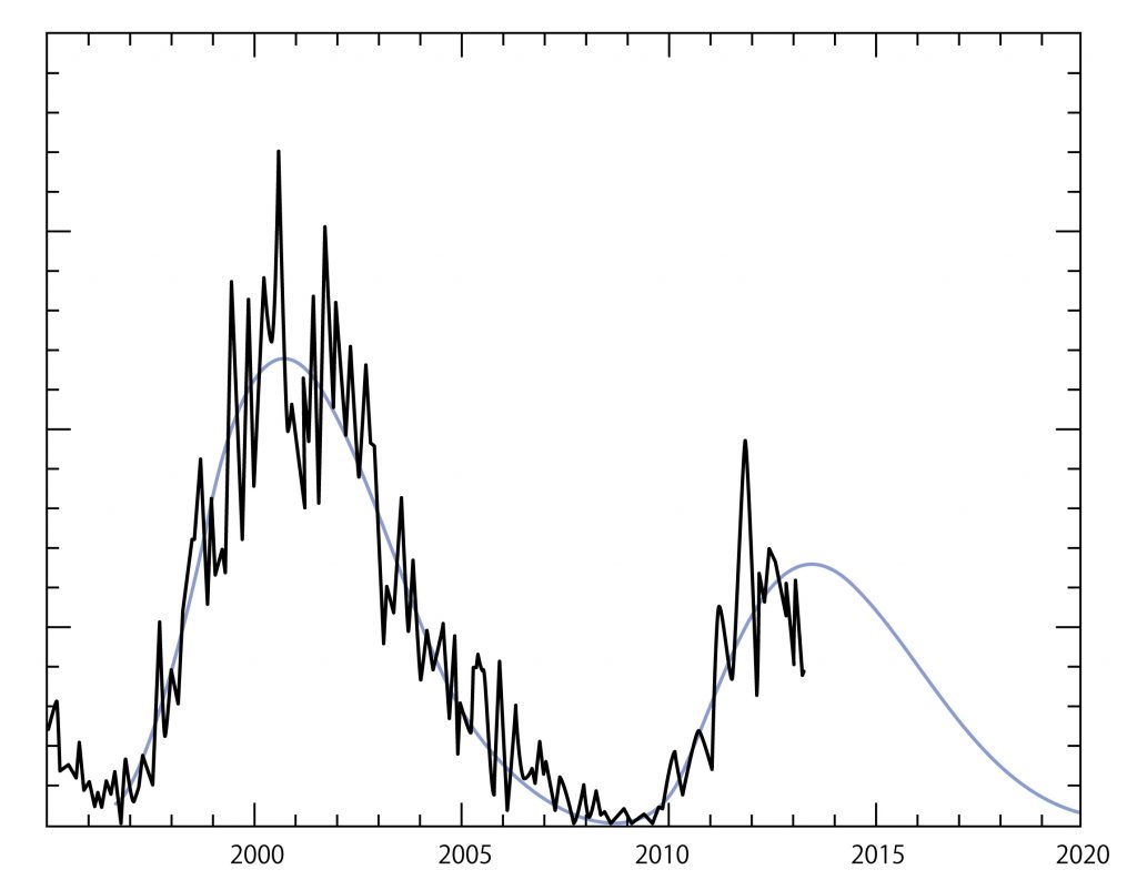 2004年から2010年までの間で、黒点がゼロだった日は836日にものぼりました。とくに2007年の半ばから09年にかけ、黒点がほとんど現れない時期がありました。「11年周期」のちょうど底の部分にあたってはいたものの、本来なら2008年には黒点は増加に転じるはずなのに、そうはならなかった。増加に転じてからも予想をはるかに下回る数しか黒点は表れていません(上図参照)。