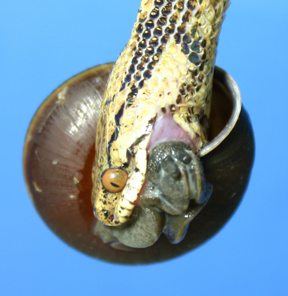 その右利きのヘビが、どうやってカタツムリを食べているのか、気になりますよねぇ(笑)。実際は、イワサキセダカヘビを捕獲し観察してわかったことなのですが、先にそちらをお話しておきましょう(下の写真を参照)。