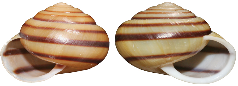 カタツムリの貝殻を上から眺めてください。螺旋が時計回りになっているのが右巻き、反時計周りなのが左巻きです。下の写真のように殻を正面に置いて見てみるとよくわかります。殻の口が右にあるのが右巻き、左にあるのが左巻きです。実は、カタツムリには右巻きと左巻きが共存する種類はほとんどなく、多くの種は右巻きなんです。しかし、わずかだが左巻きの種がいる。そして、この左巻きの種が存在することがうまく説明できない……。
