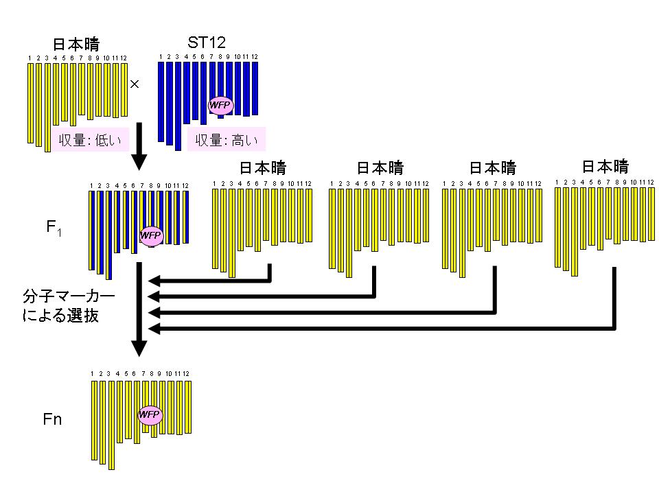 上の図を見てください。まず、日本晴とST-12を交配します。そうやってできたのが2段目の「F1」です。F1の段階では、親から受け継いだ遺伝子は50%ずつ。しかし、私たちが欲しいのはWFPを持つものだけですから、分子マーカーと呼ばれるものを使って確認して、「WFPを持たないもの」は除外し、「持つもの」だけに再び、日本晴を交配します(=戻し交配。できたのがF2で日本晴75%・WFP25%)。さらに、WFPを持つものだけに戻し交配を繰り返していくと(F3、F4……)、最終的には3段目のFnのような「日本晴の遺伝子にWFPだけが入ったもの」ができあがります。