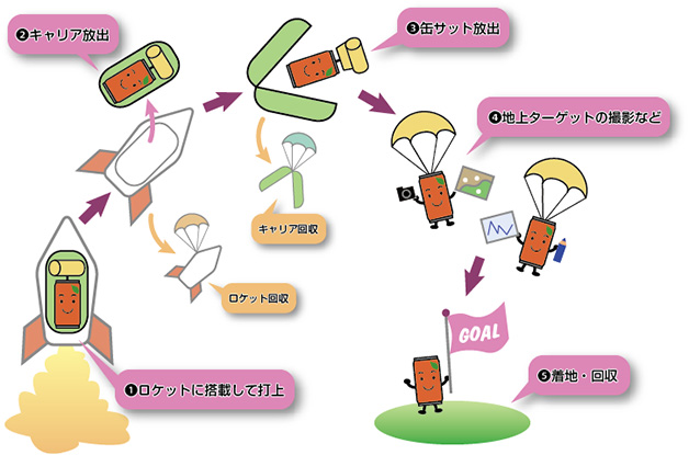 高校生が自作した缶サットおよびキャリア(缶サットを搭載する機構)を打上げ、上空での放出・降下・着地の過程を通じて、技術力・創造力を競うのが「缶サット甲子園」である(『缶サット甲子園』のWebサイトより)。下の図のようにキャリアの中に缶サットを入れ、それをロケットで打ち上げる(①、ロケットは大会本部が用意)。キャリアは上空数百メートルで放出(②)、さらにキャリアから缶サットが出て(③)、缶サットが地上に着くまでにデータを収集(④⑤)という流れになる。