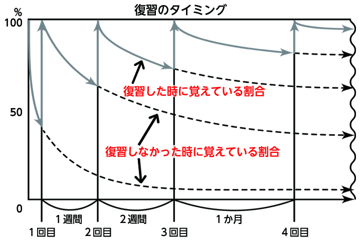 さて、ここで重要になるのが、時間が経って忘れてしまった単語も脳からなくなってしまったわけではない、という点です。たとえば、完全に思い出せなくなったあと、もう一度、同じ単語を覚えなおし同じテストを行うと、最初に比べて2回目のほうが確実に記憶がよくなります。3度目になると、さらに覚えている単語の数が増える。このことから「復習の大切さ」がわかるでしょう。復習すれば忘れる速さが遅くなるわけです。