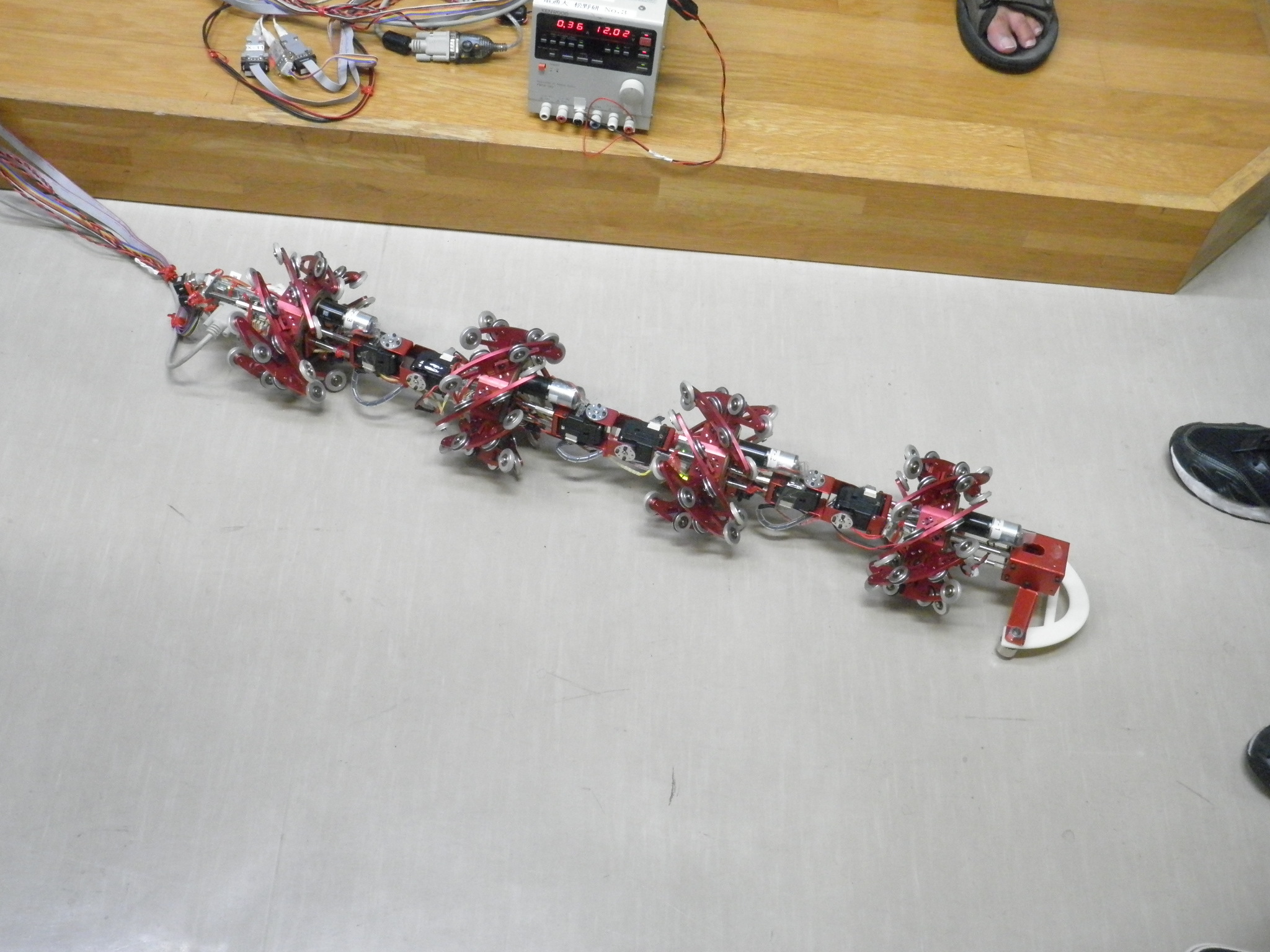 上の写真は「ねじ推進ヘビ型ロボット」。名前のとおりヘビの動きを参考にしています。主軸の回転運動が周囲のローラーに伝わって、頭の部分が誘導する方向に身体全体が進む。わずかな隙間にも入り込むことができ、また途中に障害物があっても、周囲のローラーを逆回転させることでバックすることができる優れものです。