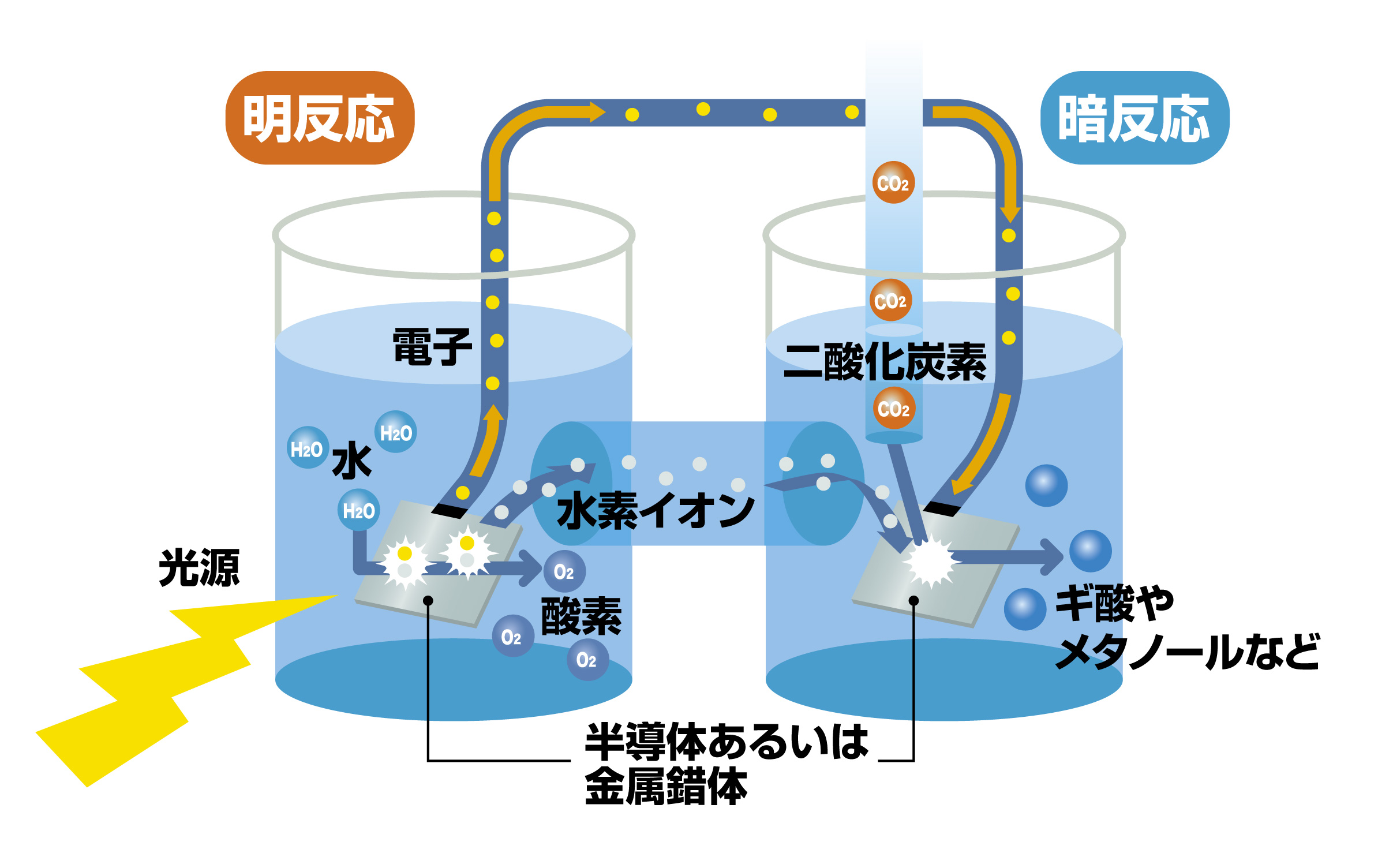上の図を見てください。これは、人工光合成システムを簡単に示したものです。左側が「明反応」の部分で、こちらに光触媒を入れて反応させます。右側が「暗反応」に相当する部分で、できた水素イオンと電子を右側に移し、二酸化炭素とそれらを反応させて、化学物質を製造します。