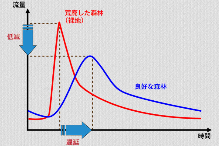 もし、この森が木々のない“裸の山”だったら、遮断蒸発がないうえ、A層が形成されにくく土壌への浸透も少ないので、下のグラフのように短時間に大量の水が流れ出てしまいます。それがひどくなると洪水――。対して、木々が生い茂る良好な森林ならば、柔らかく水を豊富に含むことができる土壌によって短時間に流れ出す水の量を減らことができるうえ、ピークになる時間も遅れる。洪水の危険性を低くすることができるわけです。さらに、この洪水低減機能だけでなく、グラフのように平常時の流量も多くなるので、利用可能な水の量(利水量)も増えます。根っこがしっかり張っているので、土砂災害も起きにくいんですね。