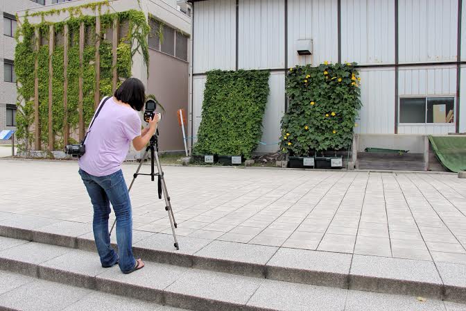 ところで、みなさんは「緑のカーテン」をご存じですか? 最近、いろいろなところで、周囲をツル状の植物で囲んだ建物を見るようになりましたが、あれが緑のカーテンです。アサガオやヘチマ、ゴーヤなんかがよく栽培されていますね。実は、これも水の循環と関係しており、緑のダムと並ぶ重要な「私の研究テーマ」なんです。