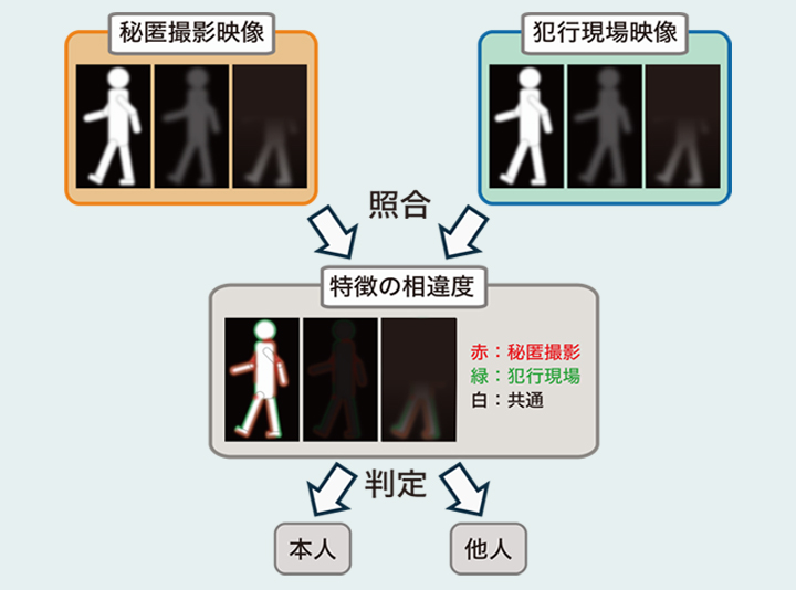 2009年、私の研究室に奈良県警からある鑑定依頼が寄せられました。持ち込まれたのは防犯カメラの映像で、前年に起きた放火未遂事件のもの。犯人の顔はわからないものの、歩いている姿が映っていました。以前であれば、とても逮捕の決め手になるものではありません。しかし、私たちは2歩分の映像があれば90%以上の精度で人物を識別できる技術を開発していました。解析の結果、容疑者とされる人物と映像の男は「同一である可能性が高い」と鑑定。これも決め手のひとつとなり、放火未遂犯は逮捕されました。残念ながら、イギリスで前年(2008年)、私の友人でもあるイギリス人研究者の技術を用いて強盗犯が逮捕されていたので、「世界初」とはいきませんでしたが、それでも世界で2例目だったのです。