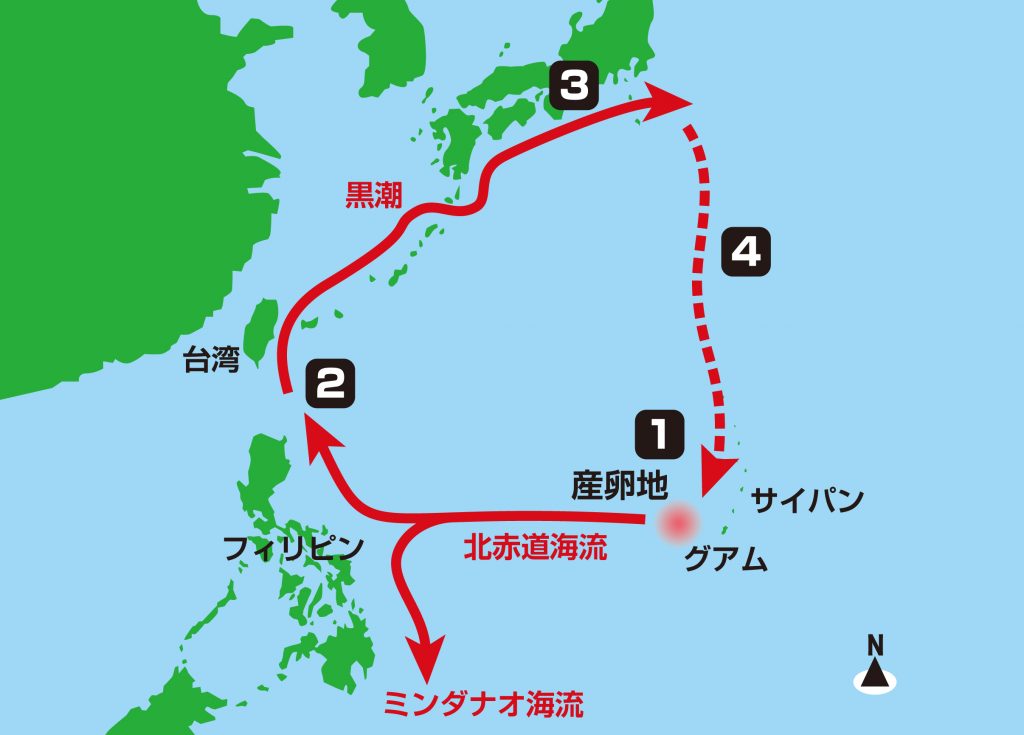 いま述べたようにウナギはマリアナ諸島、ちょうどグアムやサイパンの西のあたり(上図の①)で産卵します。生まれた子どもは「レプトセファルス」と呼ばれ北赤道海流に乗り成長しながら西に進む。そして、台湾沖(②)から黒潮に乗り、シラスウナギと呼ばれる稚魚に身体を変えます(=変態)。黒潮に乗ってさらに北上、③のように日本の沿岸・河口域に達し河川へ遡上します(この間、シラスウナギは台湾や日本の近海、および河口付近で捕獲される)。こうして川や池で成長期を過ごし、成魚になります。