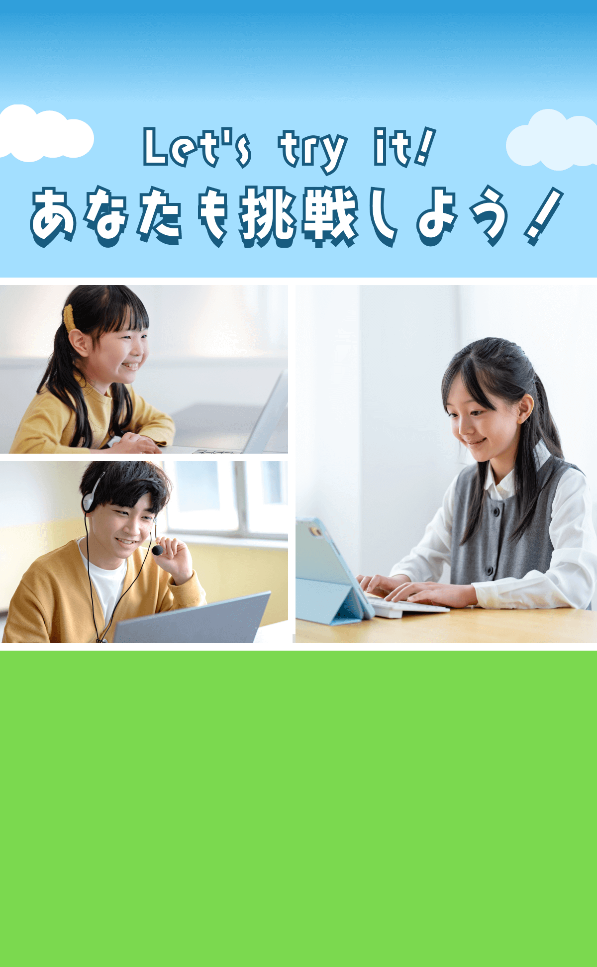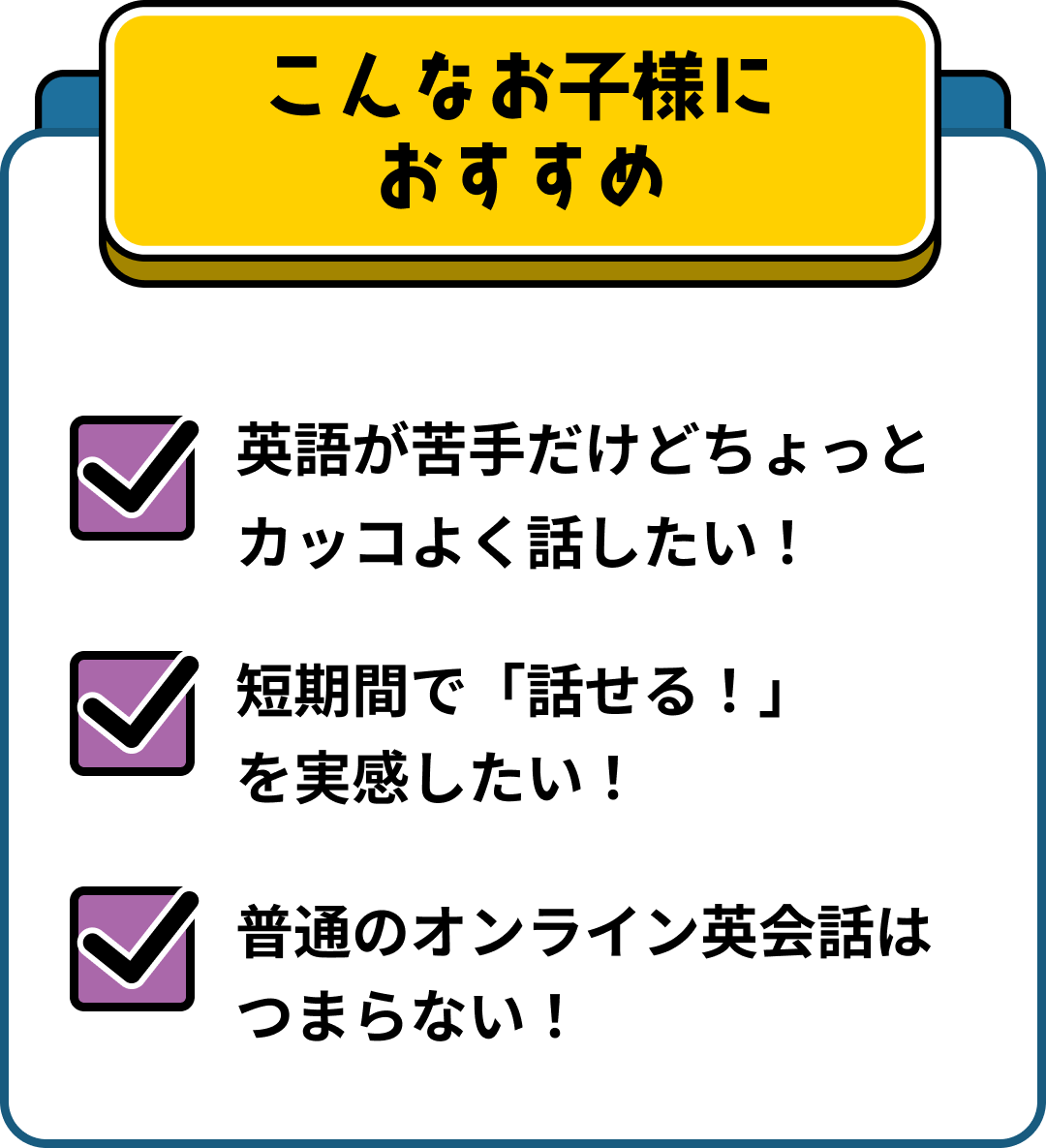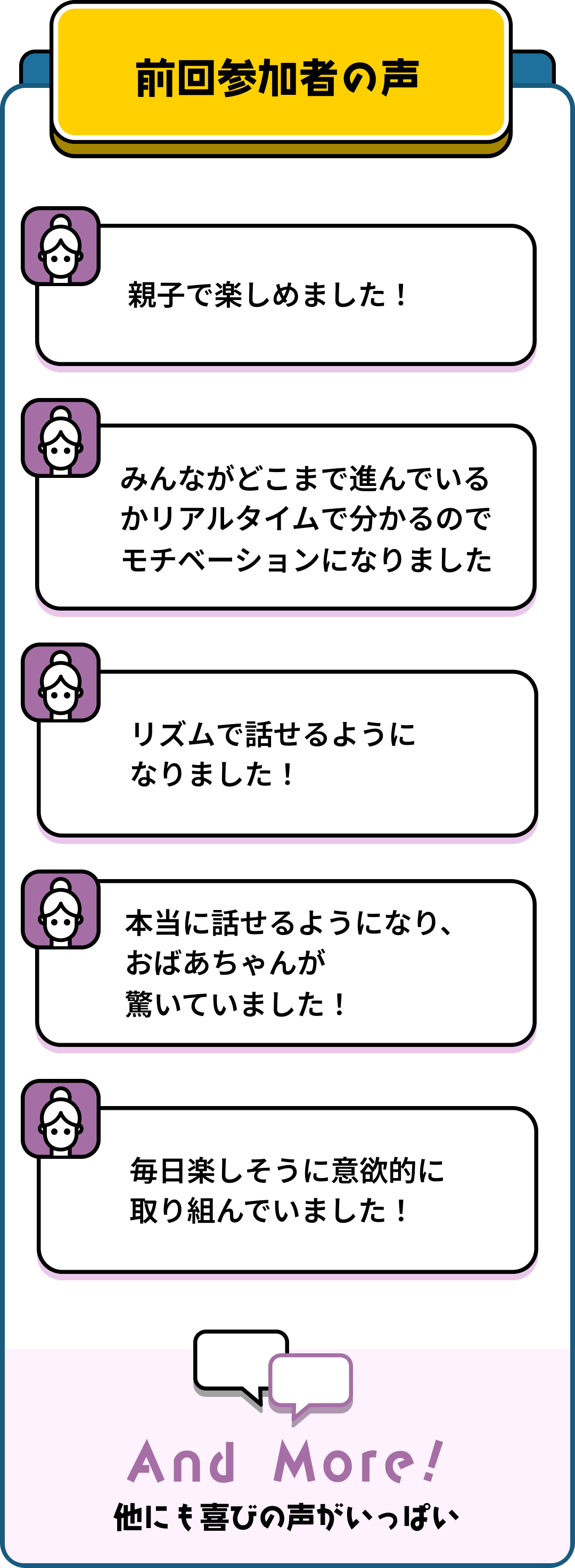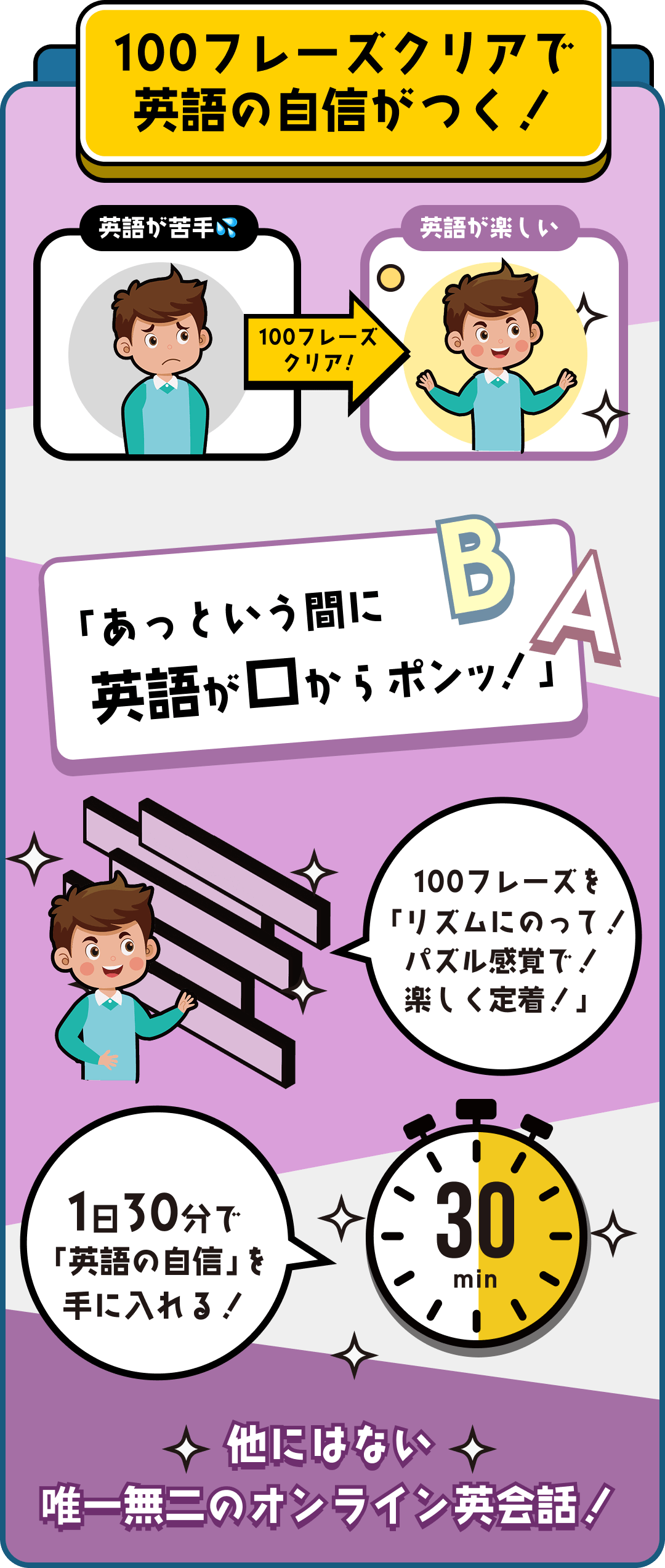 「ネイティブのように流暢に」ではなく、30フレーズでも50フレーズでも話せたら、それは立派な'話せる' ということ。お子様が英語を楽しく話せるようになることが、このプログラムのゴールです。