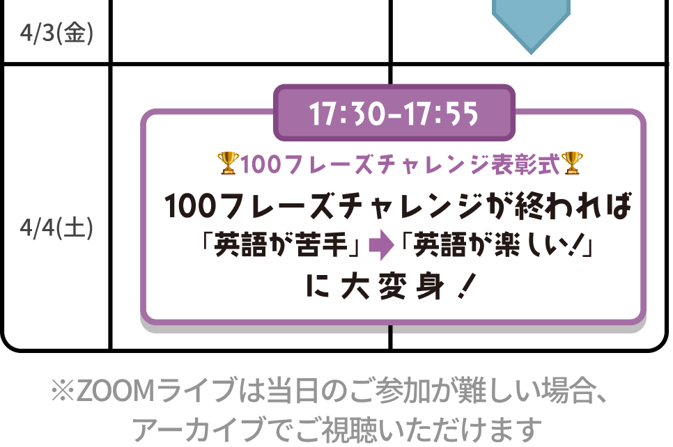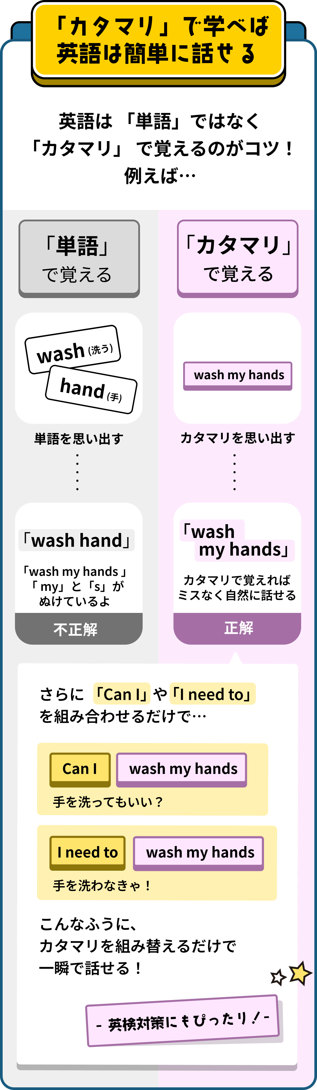 このプログラムも同じです。文法を学ぶ前に英語をカタマリで覚えることで、「in だっけ? at だっけ?」と悩まずに話せるようになります。 そして、話せるようになってから文法を学ぶと、「なるほど!」と理解できるようになります。