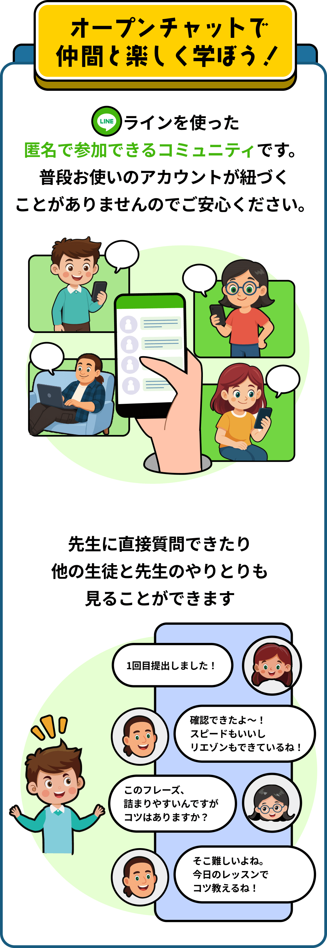 録音した英語は担当の先生がチェックし、みんなの苦手なポイントをまとめたアドバイス動画をLINEグループ内で配信します。