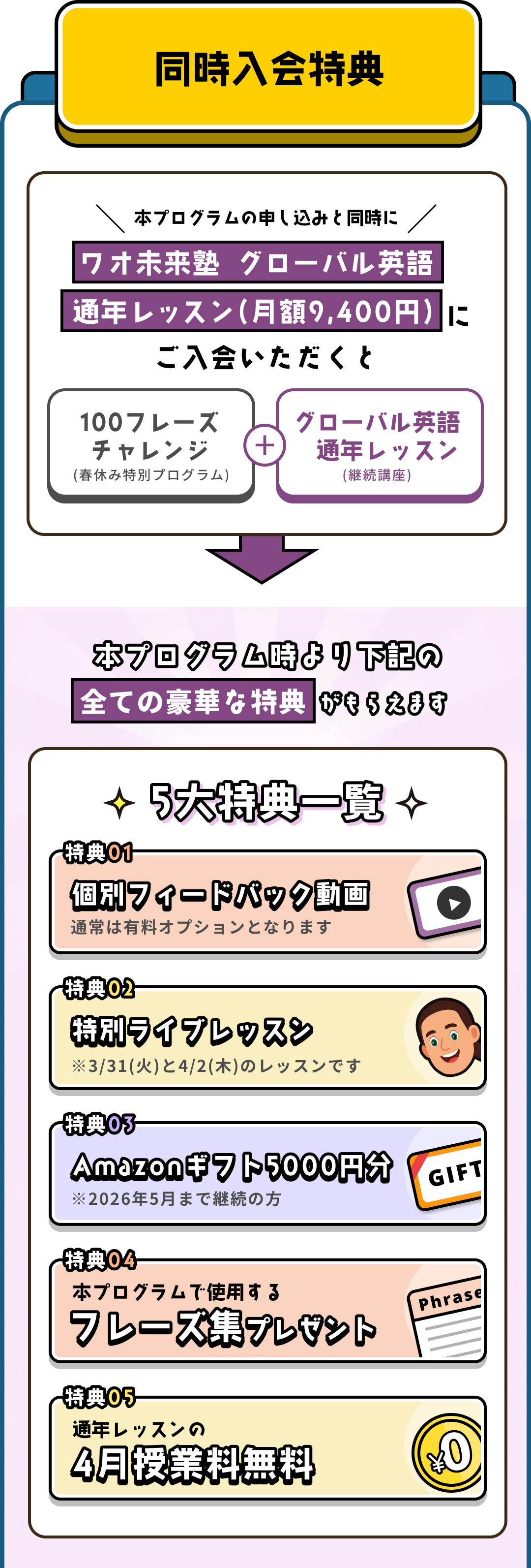 はい、話せるようになります! 日本人が英語を話せない最大の理由は、「ネイティブのように話す」という遠すぎる目標を持ってしまうことです。しかし、このプログラムでは たった8種類のフレーズ × 16種類の動作 を組み合わせることで、英作文をする必要なく100フレーズが口から出るようになります。