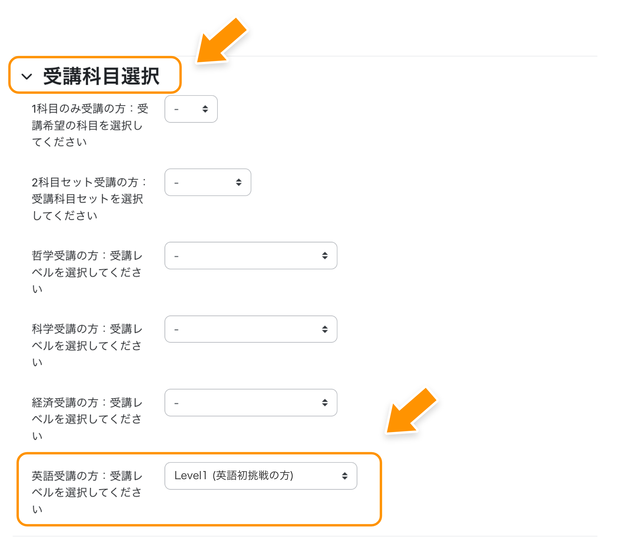 下にスクロールして「>受講科目選択」の先頭にある > をクリックして中を開き、「英語受講の方」のところでレベルをご選択ください