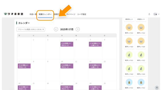 その後、ヘッダーの「受講カレンダー」のページに授業の予定が表示されるのでそこから授業ページにアクセスができます